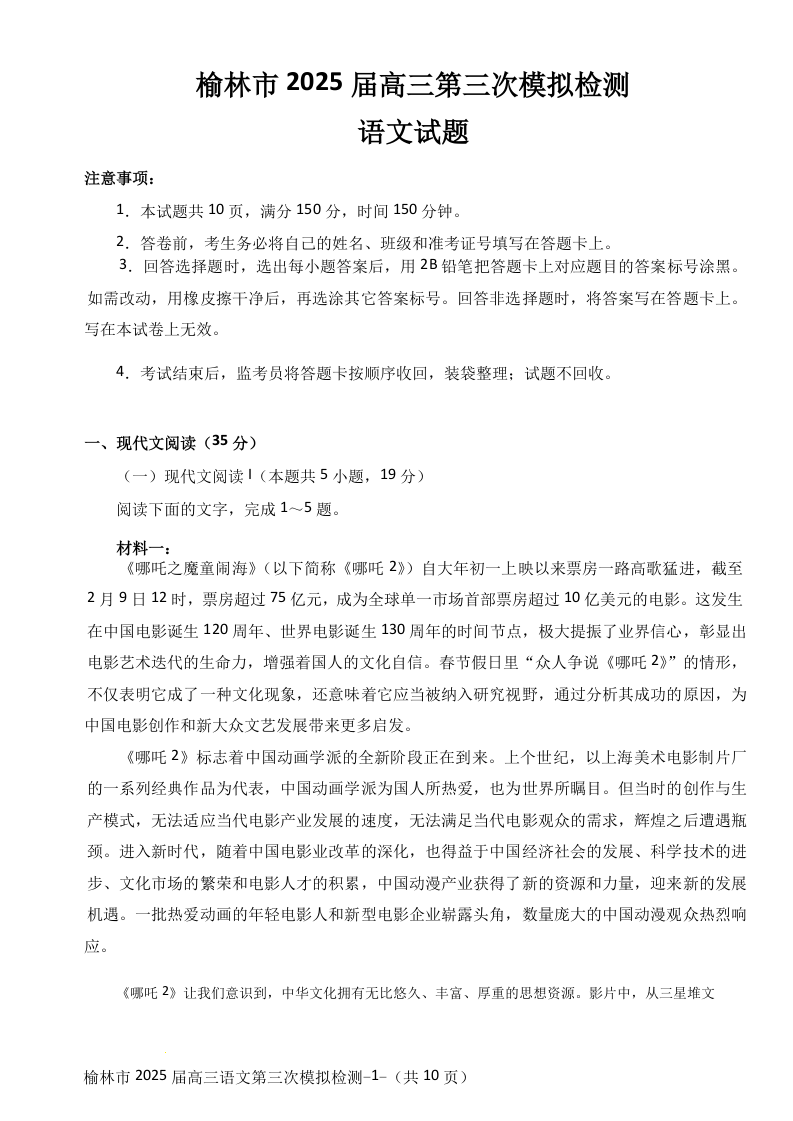 陕西省榆林市2025届高三下学期第三次模拟考试语文