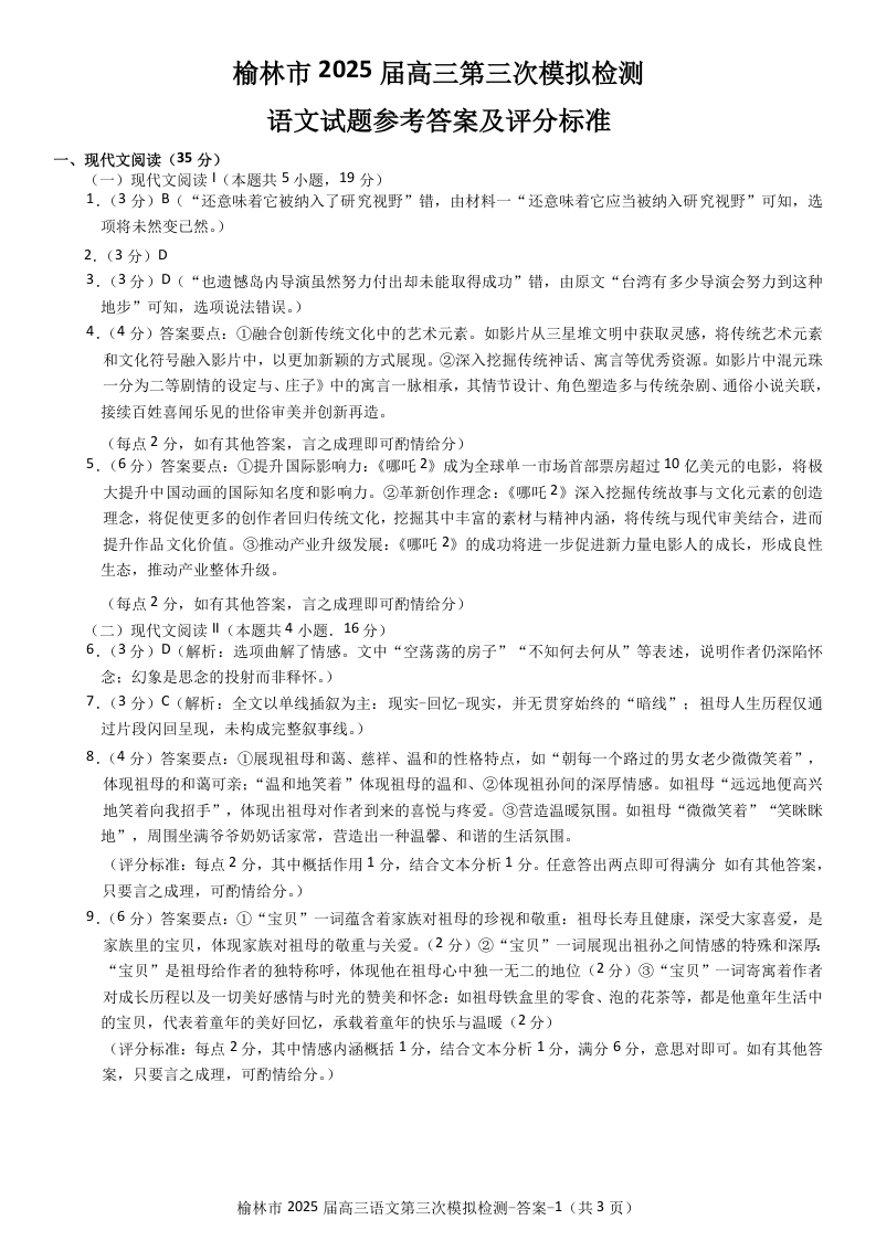 陕西省榆林市2025届高三下学期第三次模拟考试语文答案