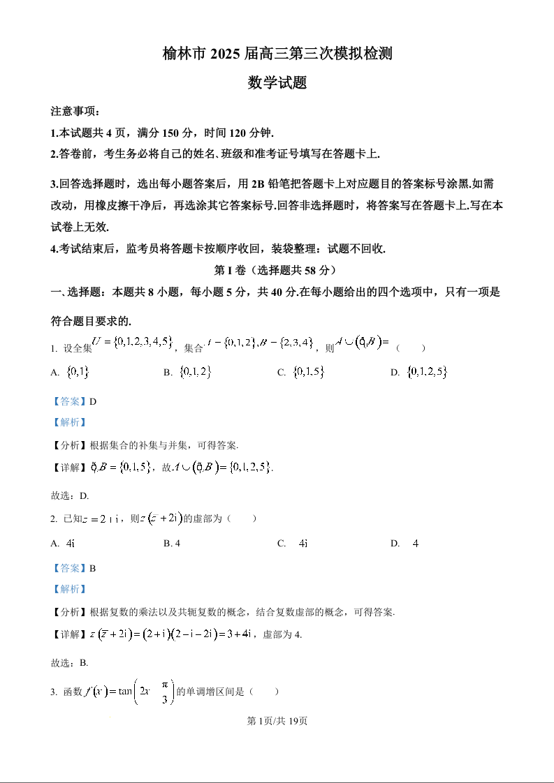 陕西省榆林市2025届高三下学期第三次模拟考试数学(精品解析版)