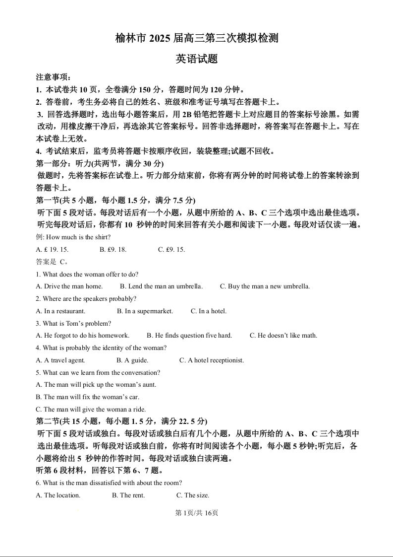 陕西省榆林市2025届高三下学期第三次模拟考试英语+答案