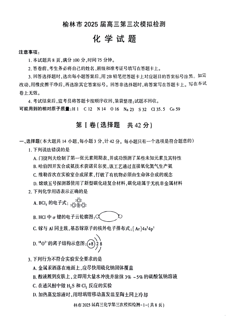 陕西省榆林市2025届高三下学期第三次模拟考试化学