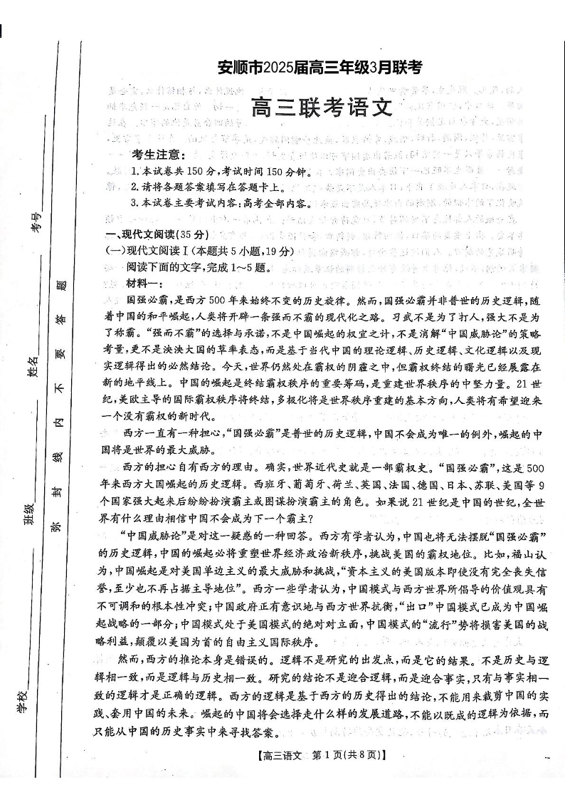 贵州省安顺市2025届高三下学期3月二模联考语文
