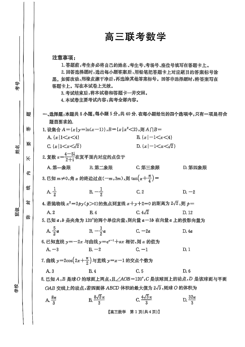贵州省安顺市2025届高三下学期3月二模联考数学