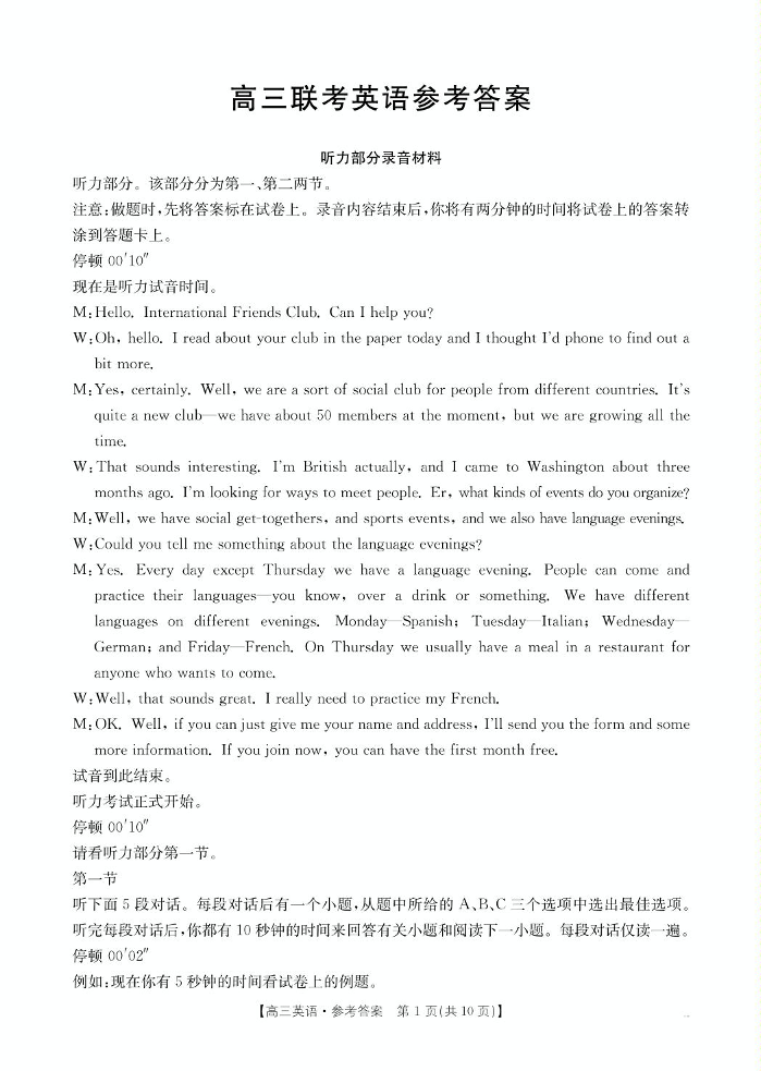 贵州省安顺市2025届高三下学期3月二模联考英语答案