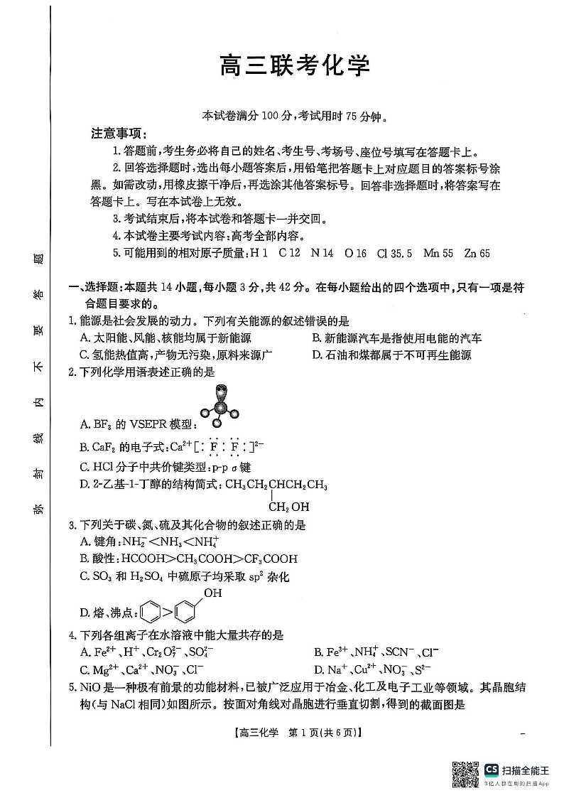 贵州省安顺市2025届高三下学期3月二模联考化学