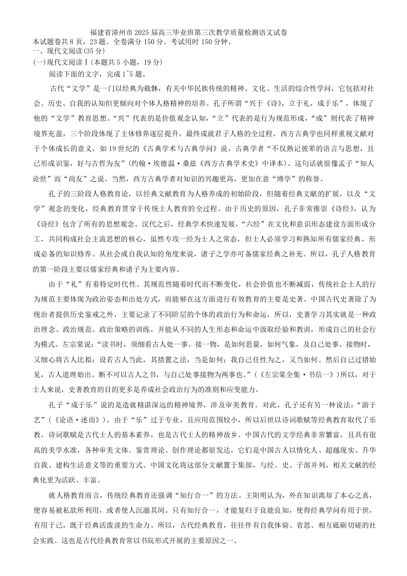 福建省漳州市2025届高三毕业班第三次教学质量检测(漳州二模)语文+答案