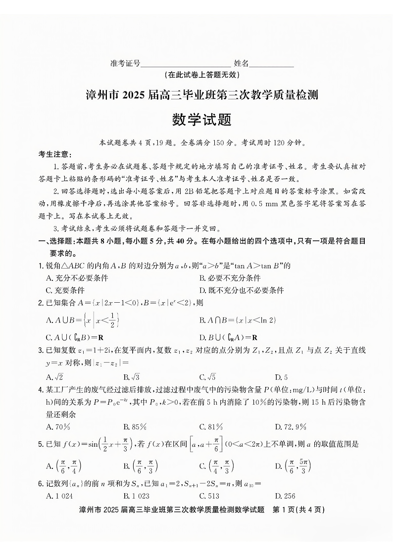 福建省漳州市2025届高三毕业班第三次教学质量检测(漳州二模)数学+答案