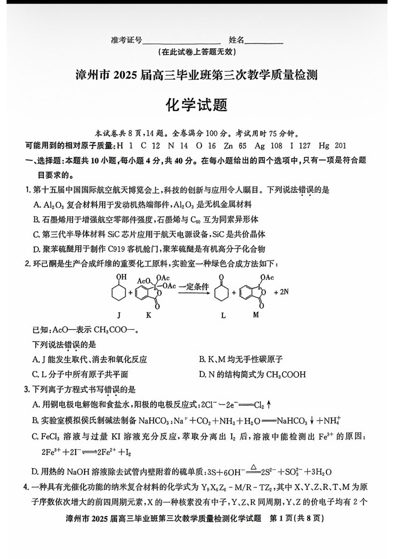 福建省漳州市2025届高三毕业班第三次教学质量检测(漳州二模)化学+答案