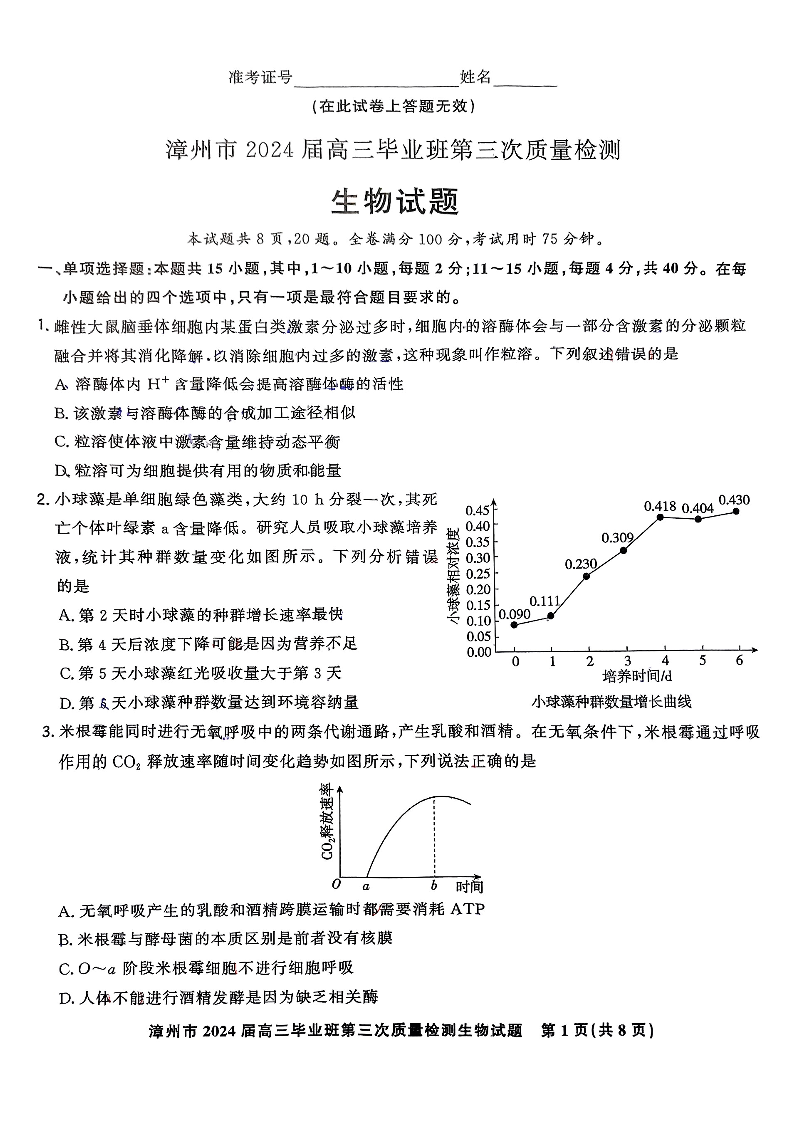 福建省漳州市2025届高三毕业班第三次教学质量检测(漳州二模)生物