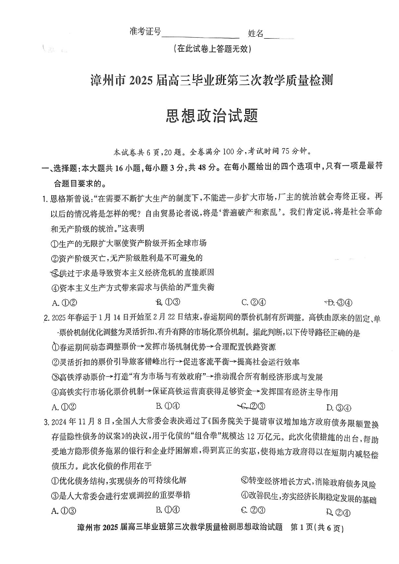 福建省漳州市2025届高三毕业班第三次教学质量检测(漳州二模)政治+答案
