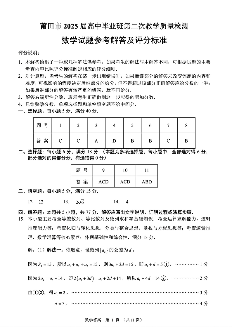 福建省莆田市2025届高中毕业班第二次教学质量检测(莆田二模)数学答案