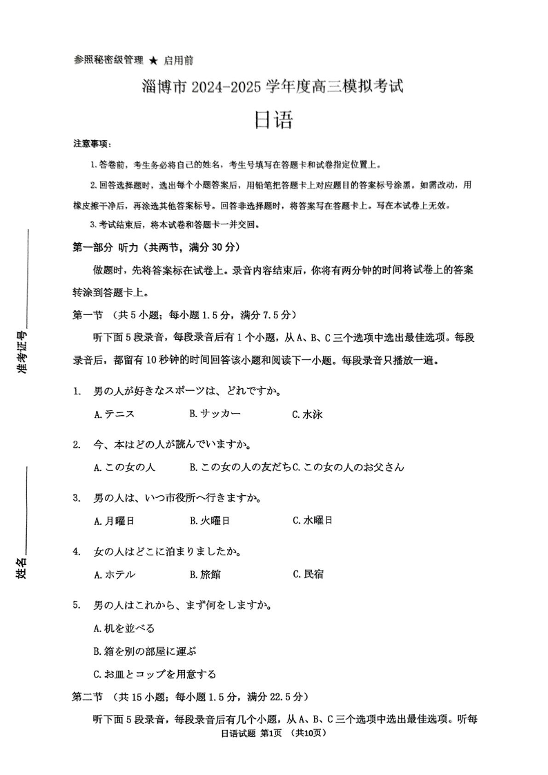 山东省淄博市2024-2025学年下学期3月高三一模统考日语