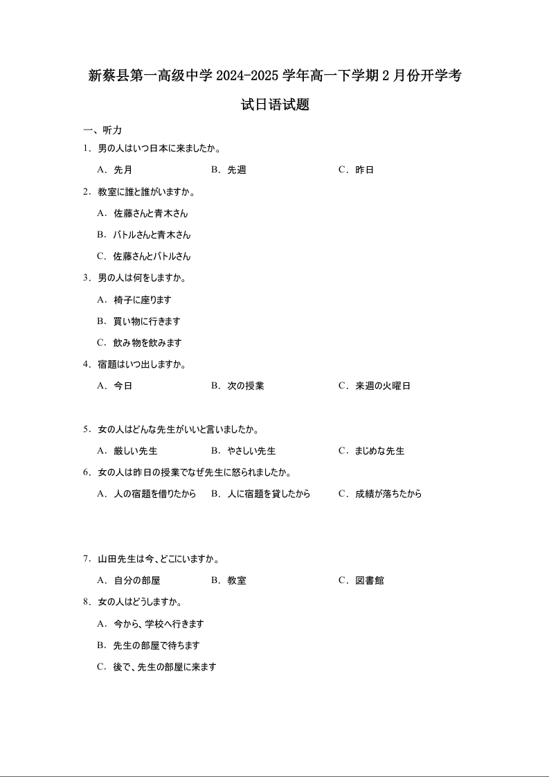 河南省驻马店市新蔡县一中2024-2025学年下学期2月高一月考日语+答案