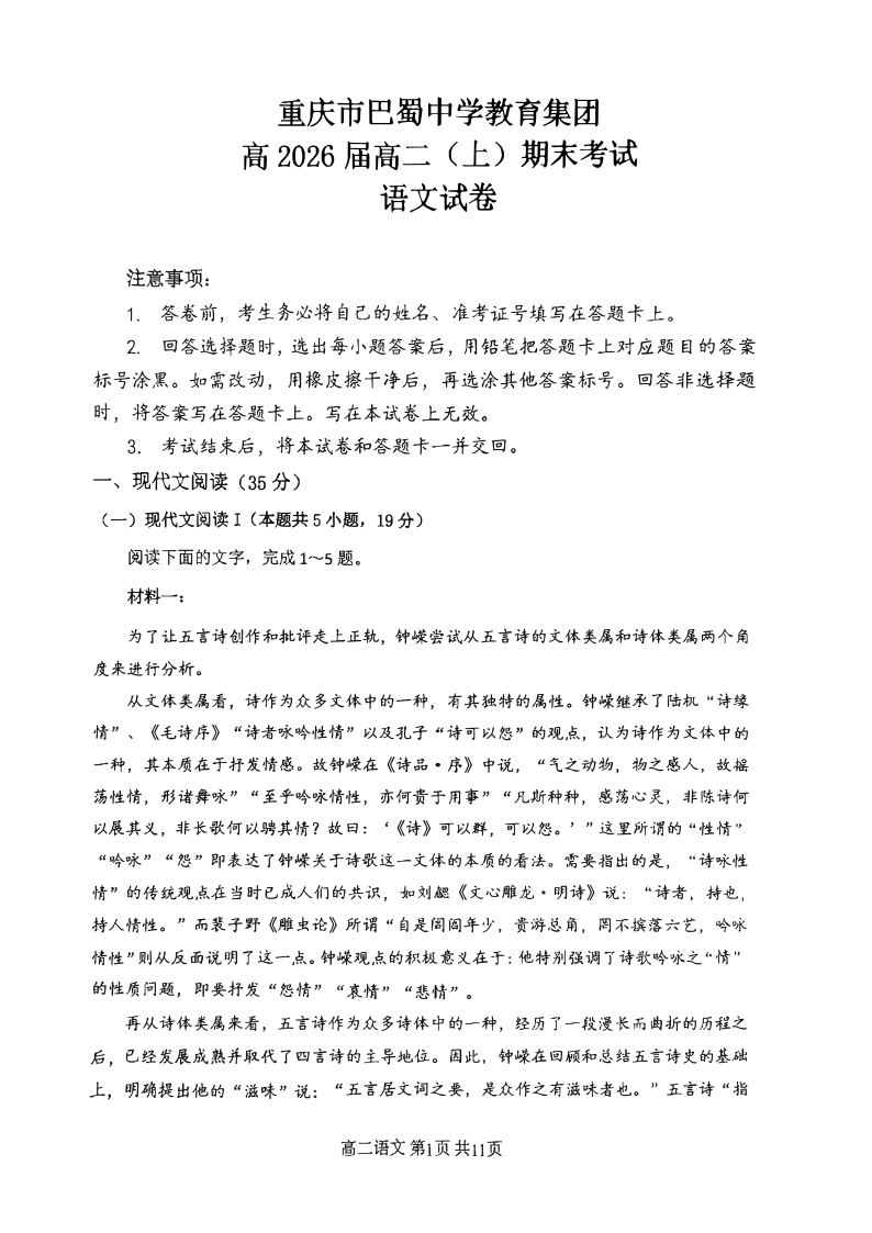 重庆市巴蜀中学教育集团2024-2025学年上学期1月高二期末考试语文