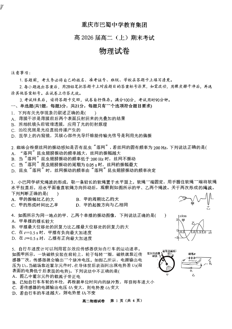 重庆市巴蜀中学教育集团2024-2025学年上学期1月高二期末考试物理
