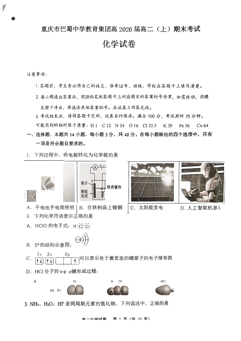 重庆市巴蜀中学教育集团2024-2025学年上学期1月高二期末考试化学