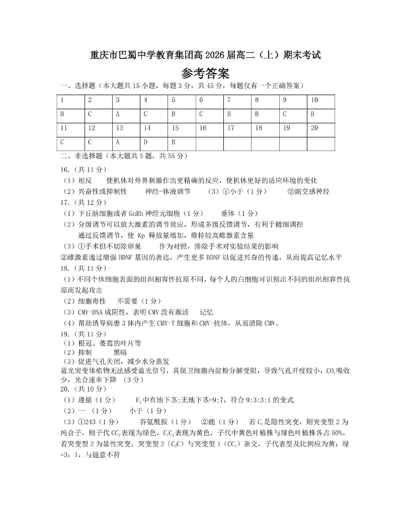 重庆市巴蜀中学教育集团2024-2025学年上学期1月高二期末考试生物答案