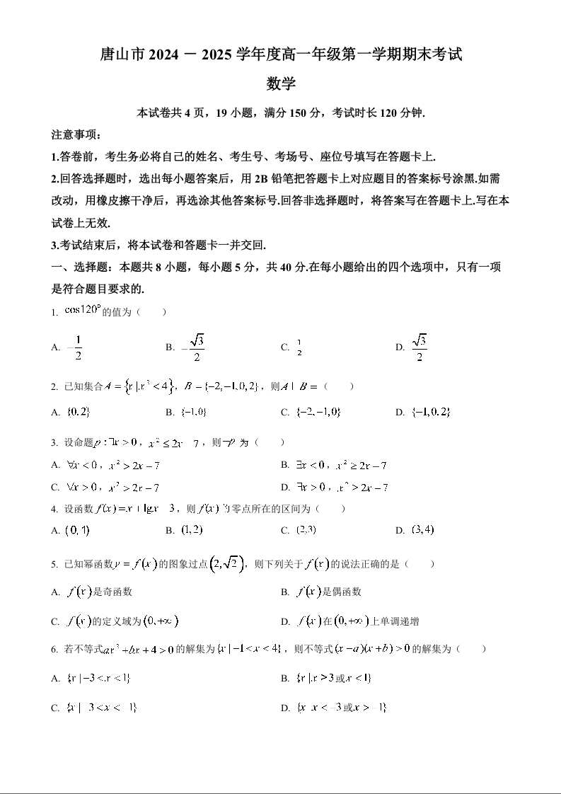 河北省唐山市2024-2025学年上学期1月高一期末考试数学(原卷版)
