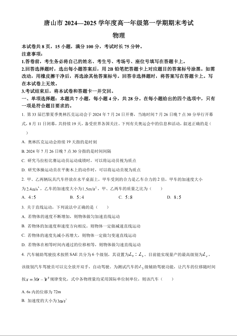 河北省唐山市2024-2025学年上学期1月高一期末考试物理+答案