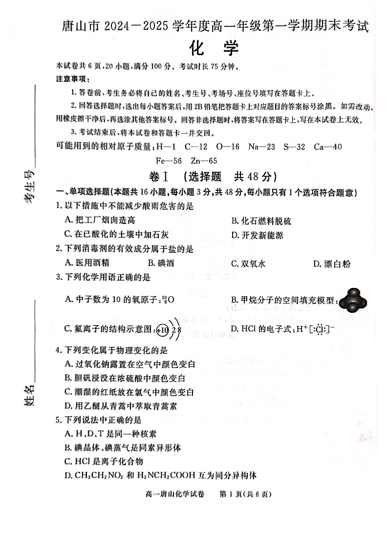 河北省唐山市2024-2025学年上学期1月高一期末考试化学