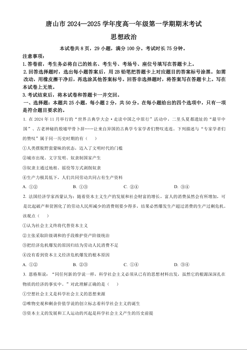 河北省唐山市2024-2025学年上学期1月高一期末考试政治(原卷版)