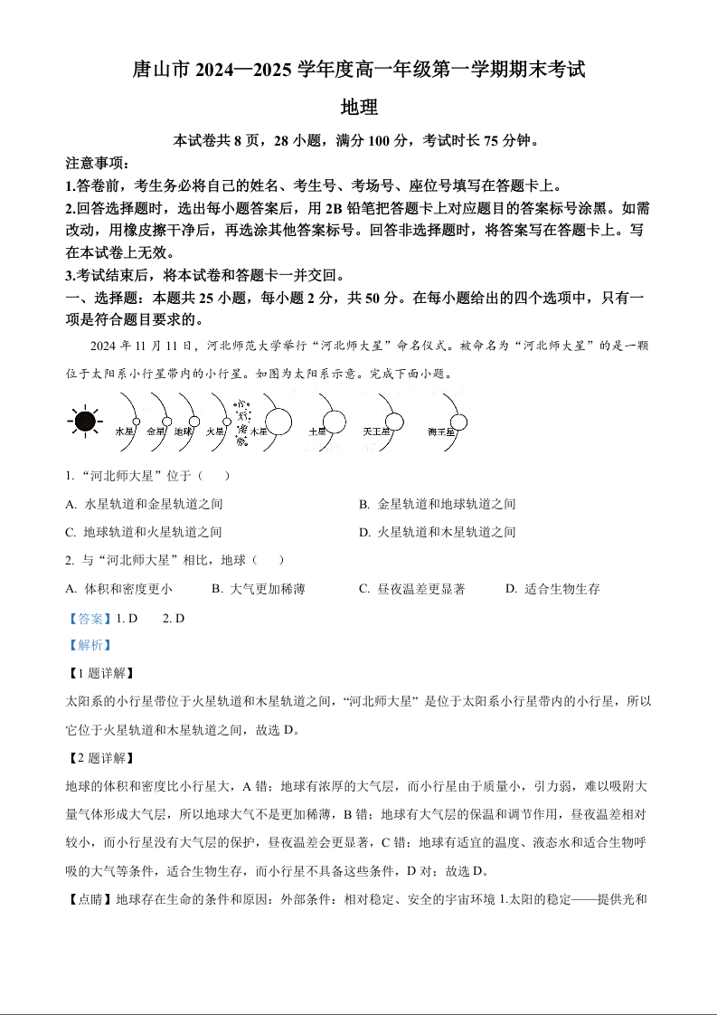 河北省唐山市2024-2025学年上学期1月高一期末考试地理(解析版)
