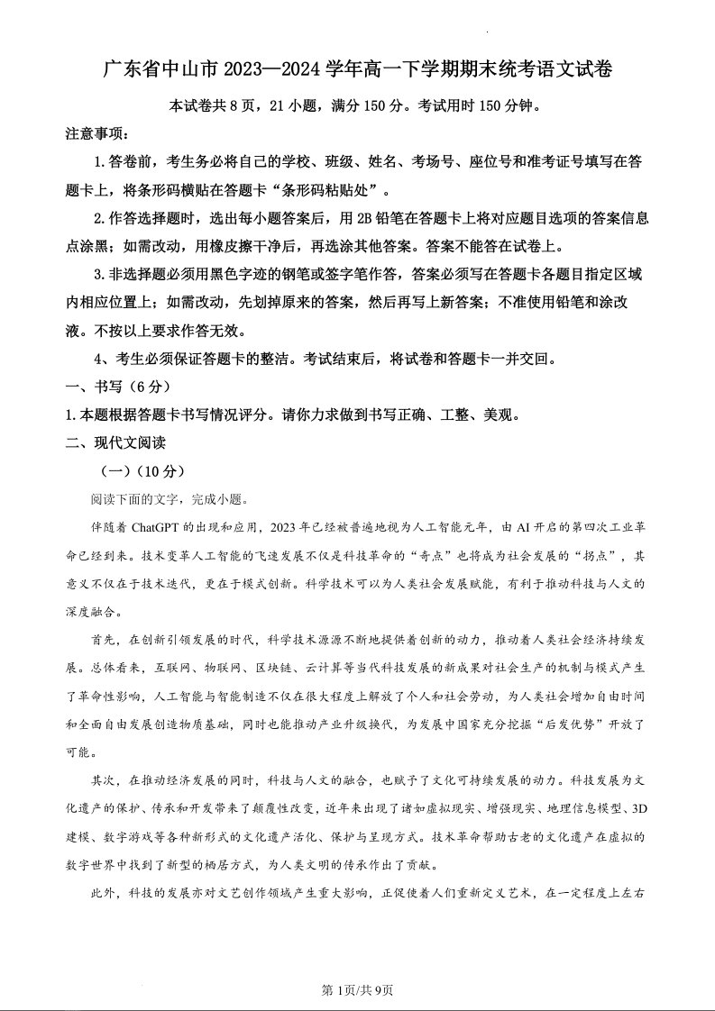 广东省中山市2023-2024学年高一下学期期末统一考试语文(原卷版)