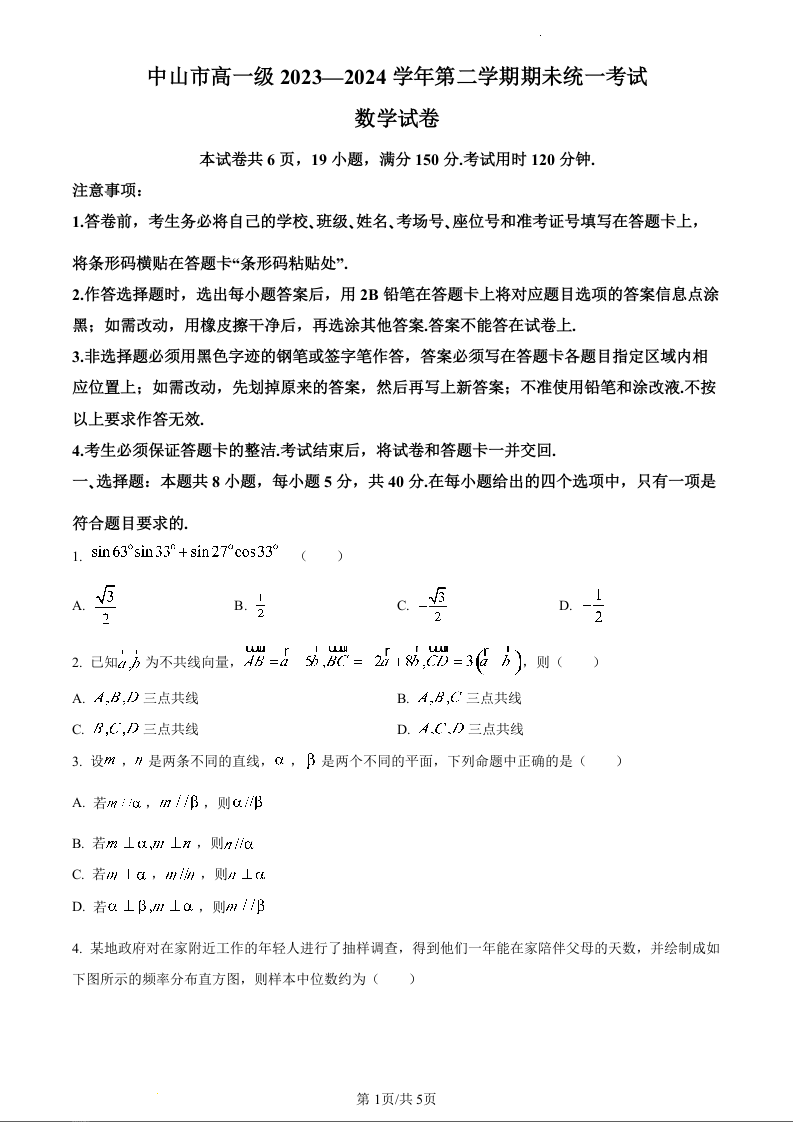 广东省中山市2023-2024学年高一下学期期末统一考试数学(原卷版)