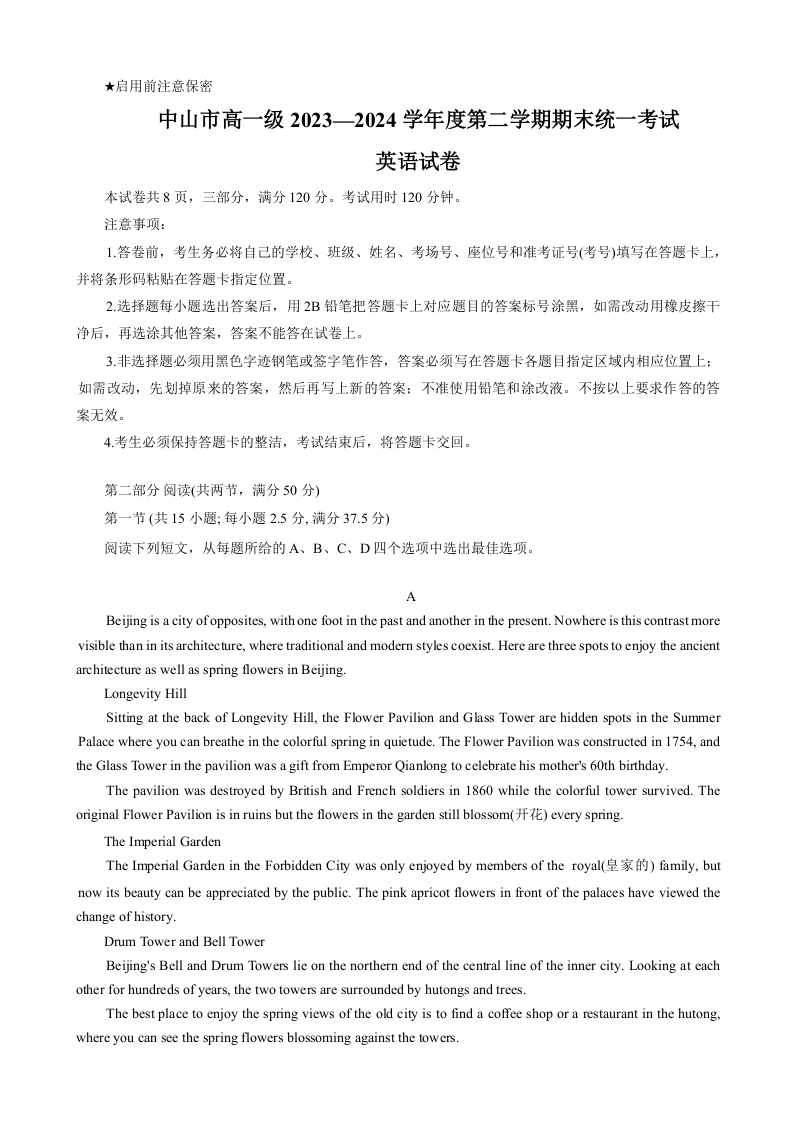 广东省中山市2023-2024学年高一下学期期末统一考试英语
