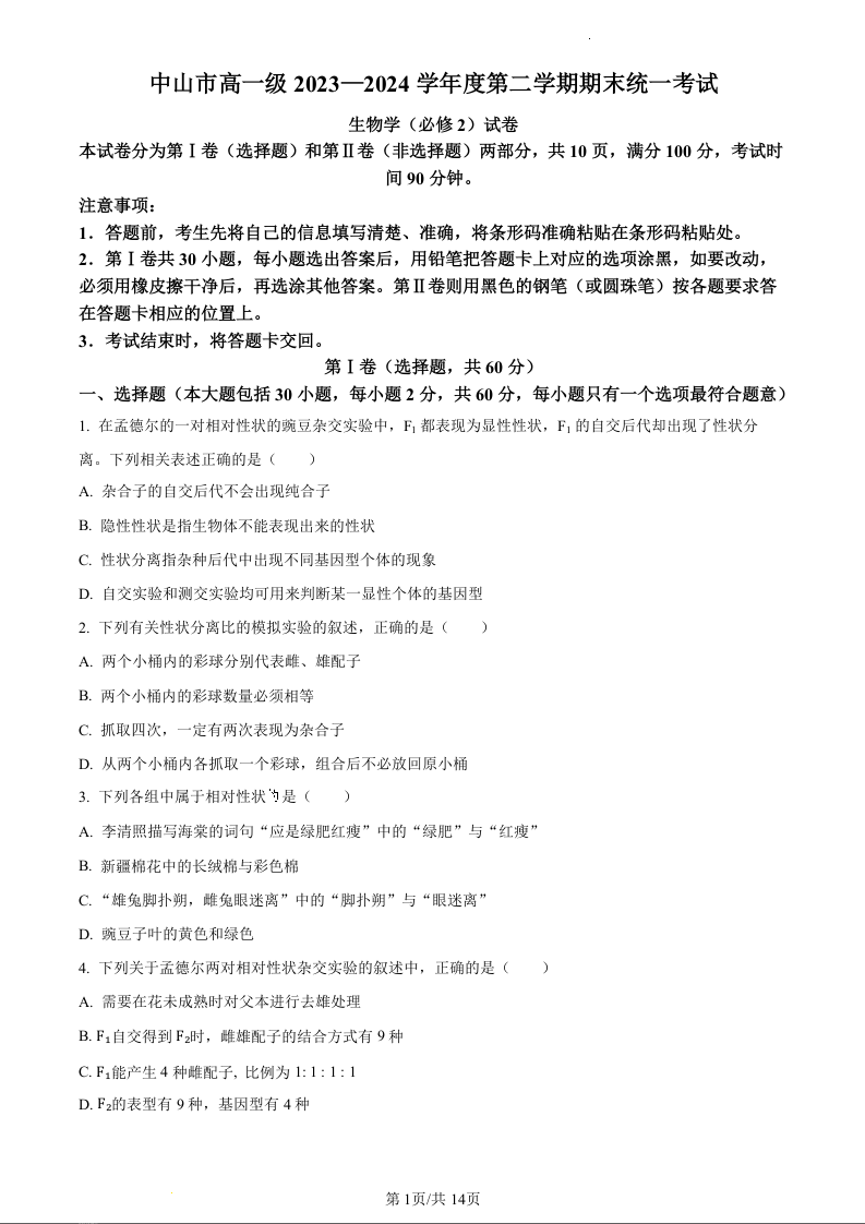 广东省中山市2023-2024学年高一下学期期末统一考试生物(原卷版)