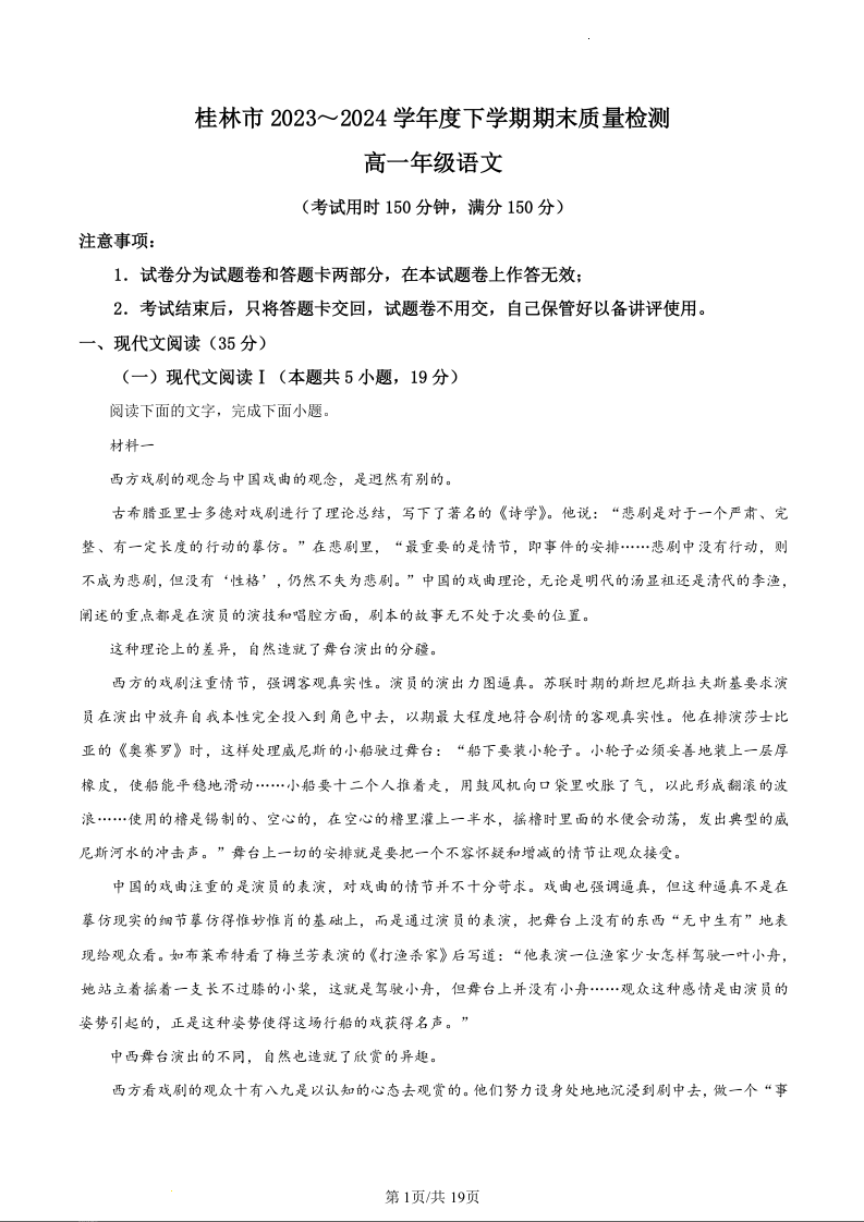 广西桂林市2023—2024学年高一下学期期末质量检测考试语文(精品解析版)