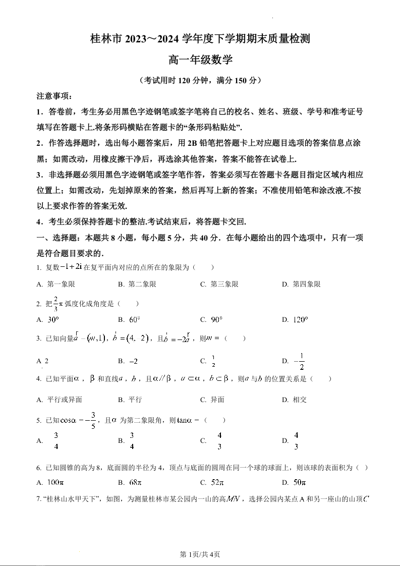 广西桂林市2023—2024学年高一下学期期末质量检测考试数学(原卷版)
