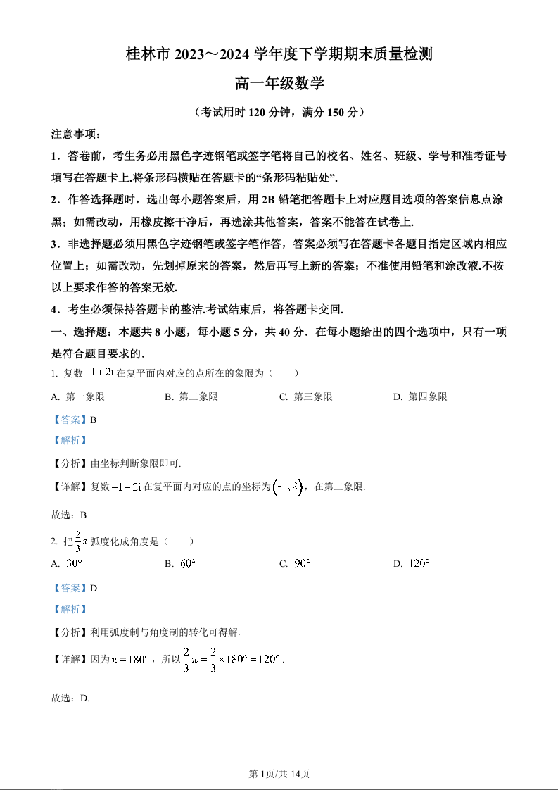 广西桂林市2023—2024学年高一下学期期末质量检测考试数学(精品解析版)