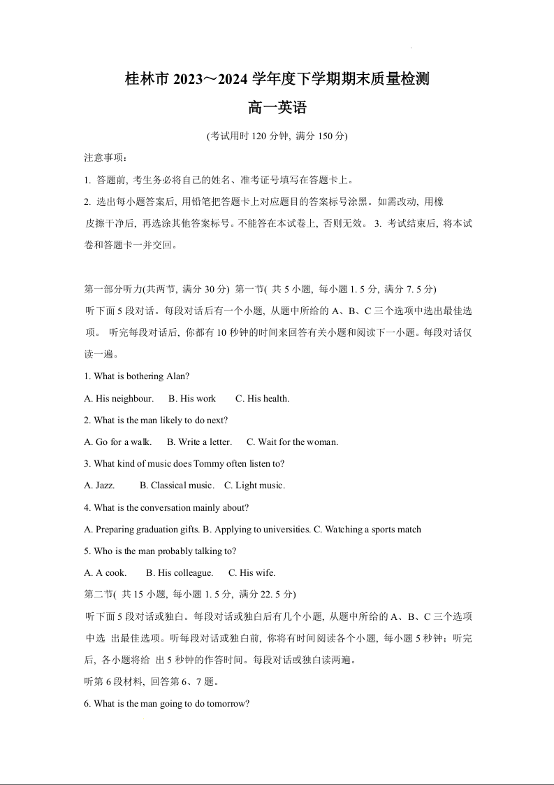广西桂林市2023—2024学年高一下学期期末质量检测考试英语