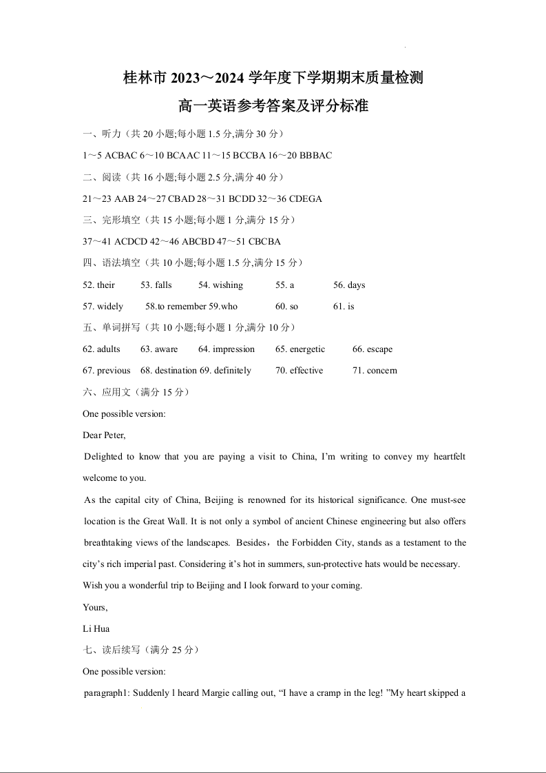 广西桂林市2023—2024学年高一下学期期末质量检测考试英语答案