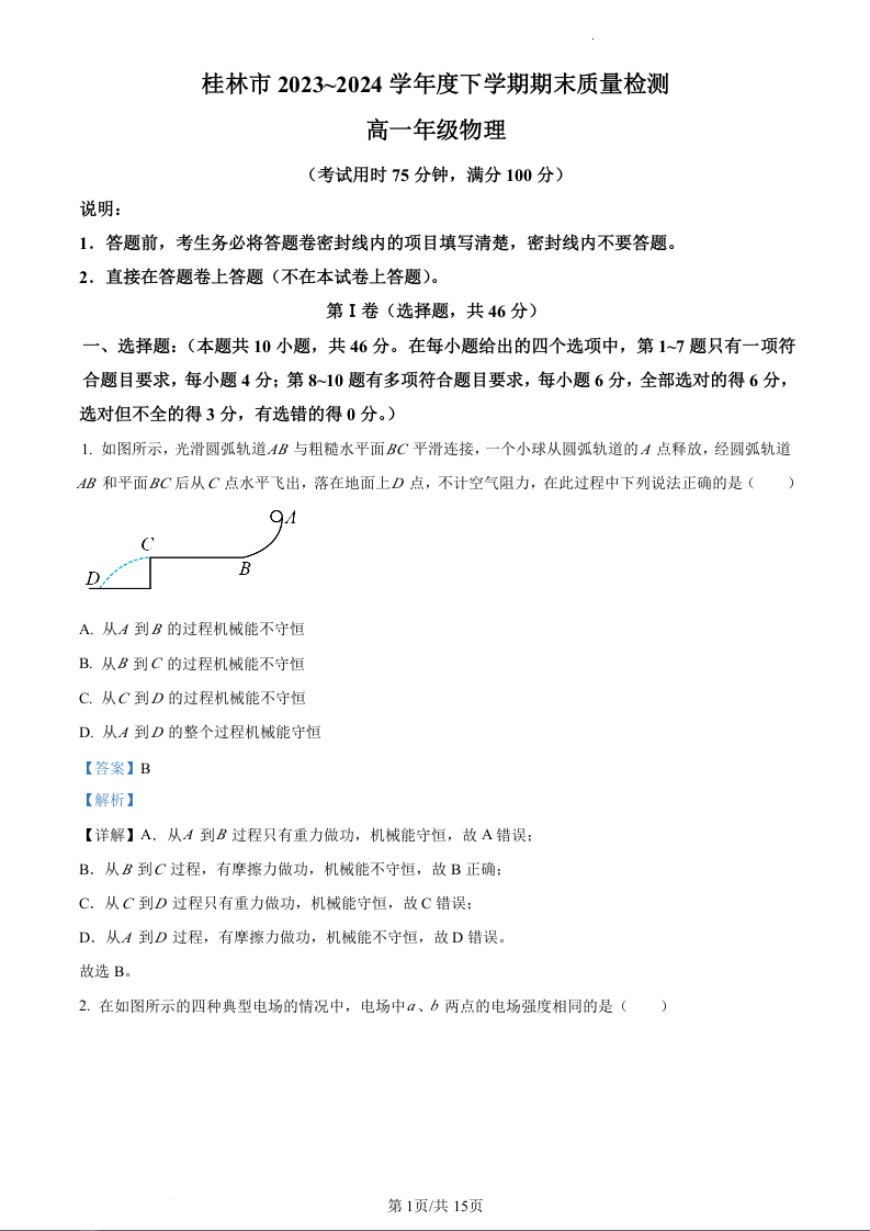 广西桂林市2023—2024学年高一下学期期末质量检测考试物理(精品解析版)