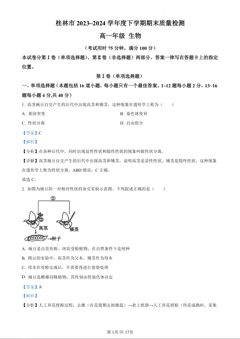广西桂林市2023—2024学年高一下学期期末质量检测考试生物(精品解析版)