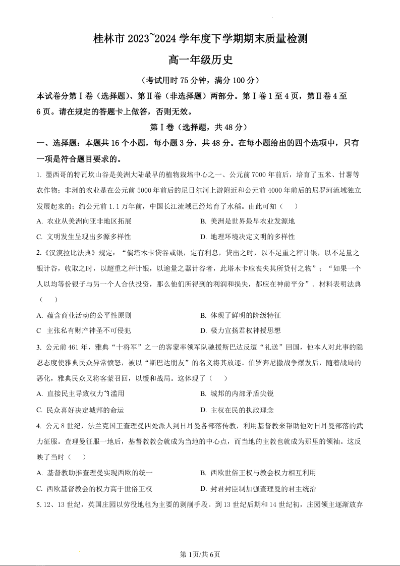 广西桂林市2023—2024学年高一下学期期末质量检测考试历史(原卷版)
