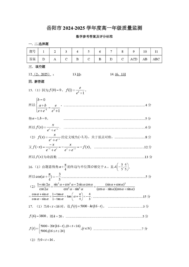 湖南省岳阳市2024-2025学年上学期1月高一期末考试数学答案