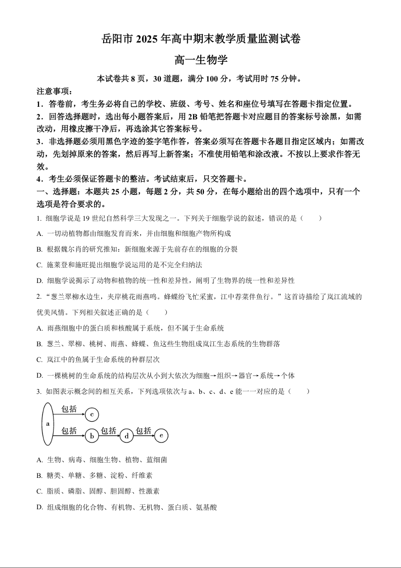湖南省岳阳市2024-2025学年上学期1月高一期末考试生物+答案