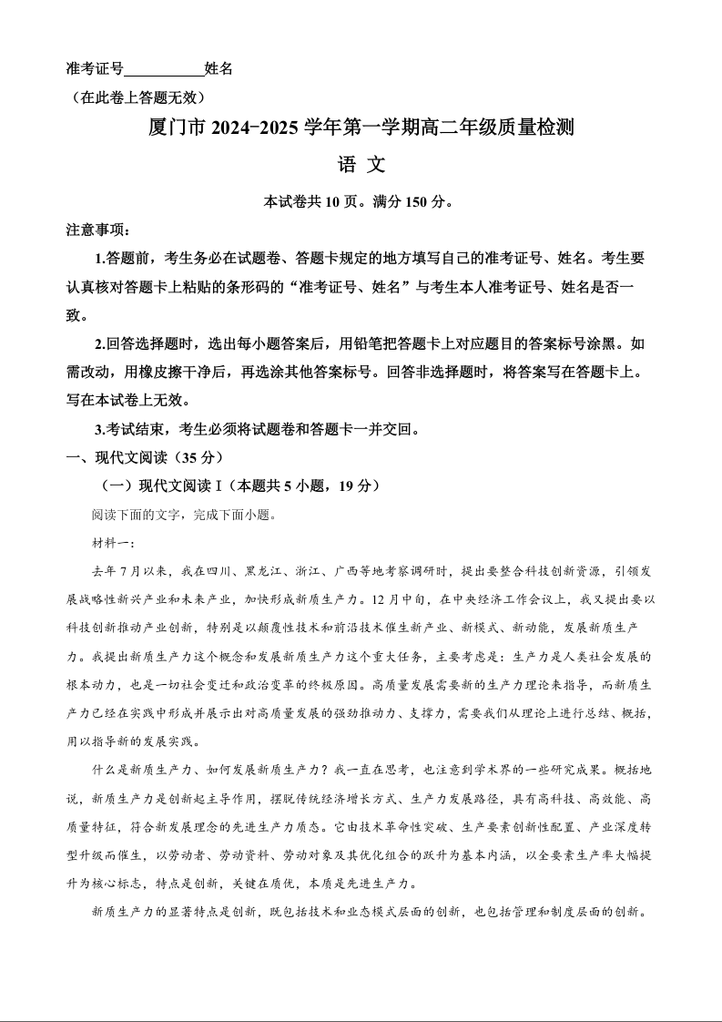福建省厦门市2024-2025学年上学期1月高二期末考试语文(解析版)