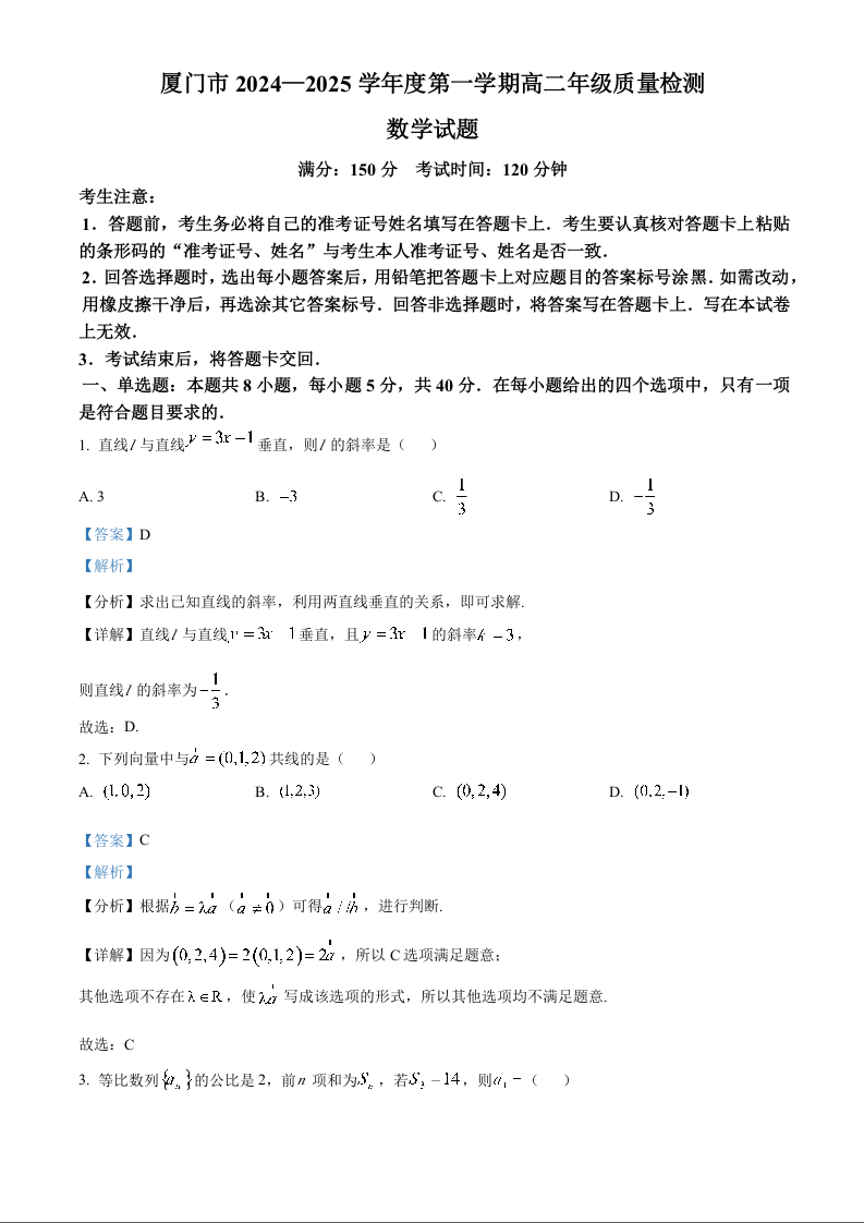 福建省厦门市2024-2025学年上学期1月高二期末考试数学(解析版)