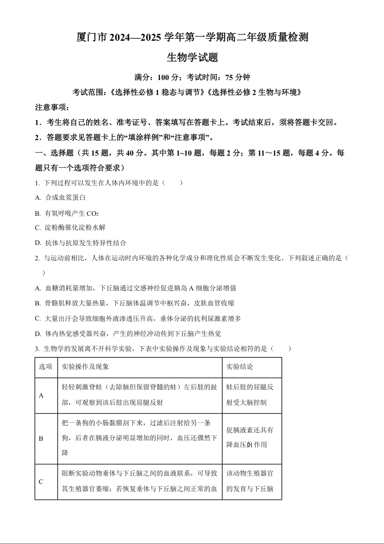福建省厦门市2024-2025学年上学期1月高二期末考试生物(原卷版)