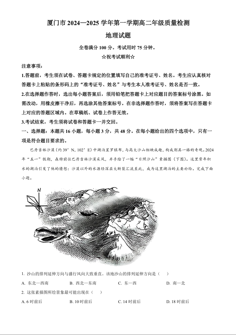福建省厦门市2024-2025学年上学期1月高二期末考试地理(解析版)