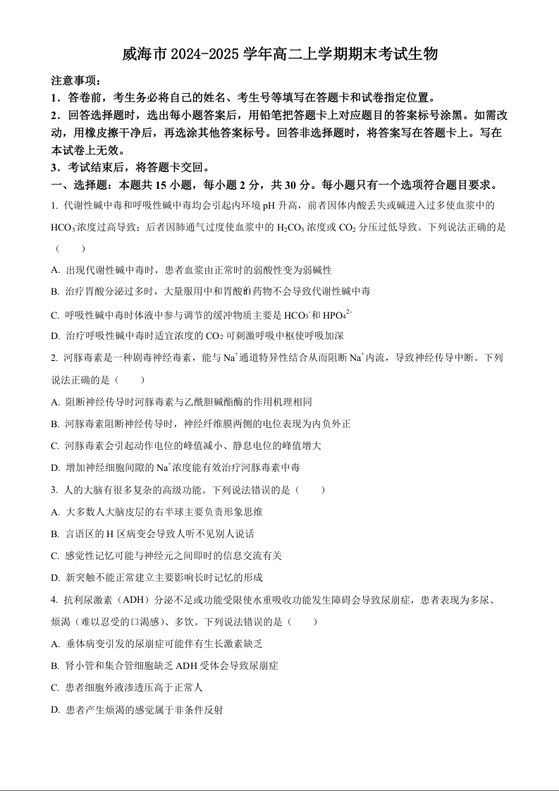 山东省威海市2024-2025学年上学期1月高二期末考试生物+答案