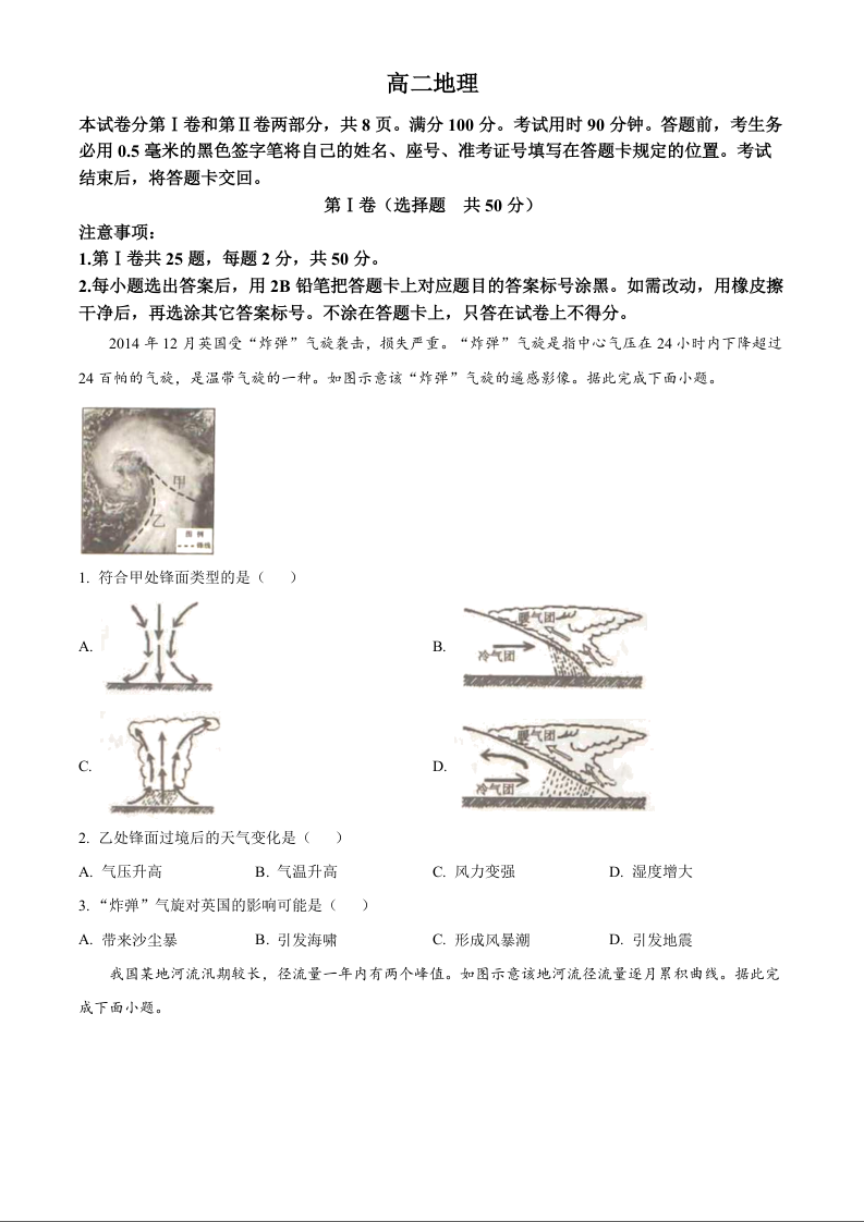 山东省威海市2024-2025学年上学期1月高二期末考试地理(原卷版)