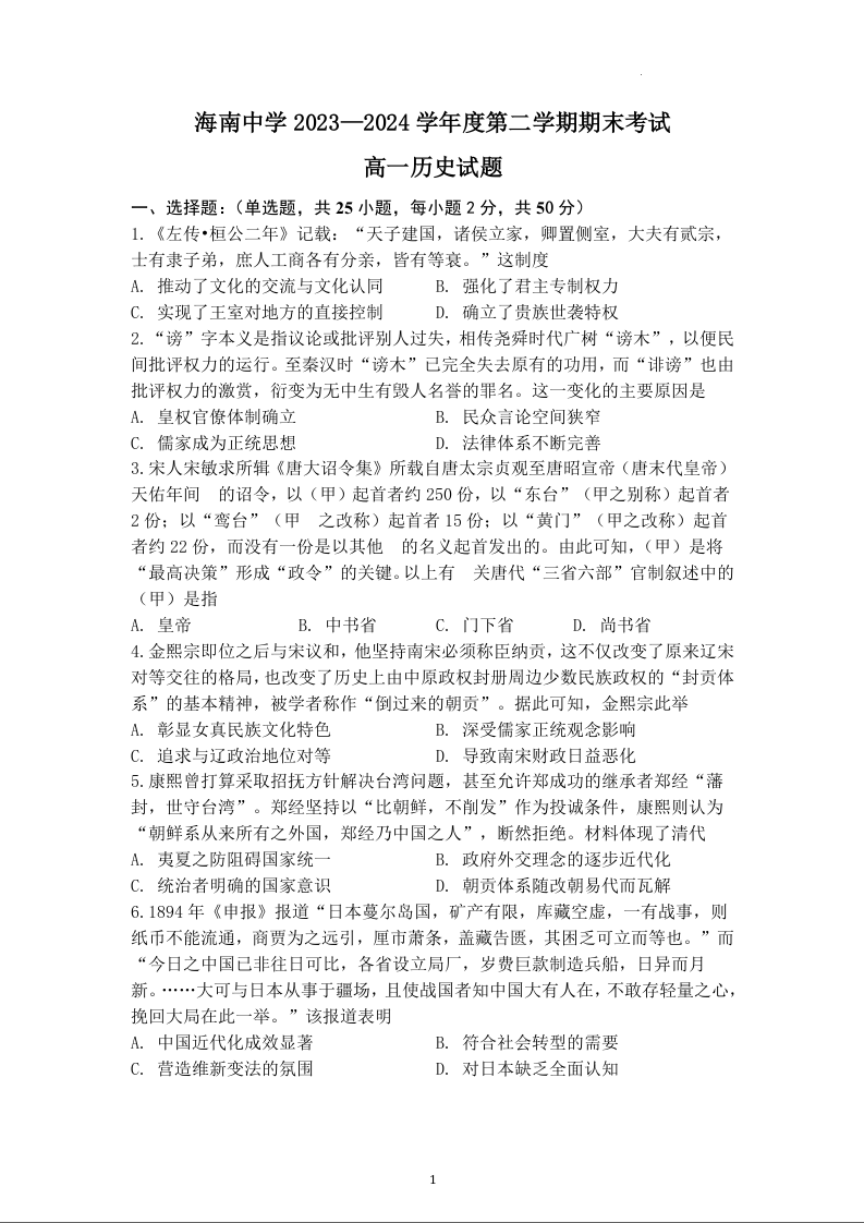 海南省海口市海南中学2023-2024学年高一下学期7月期末考试历史+答案