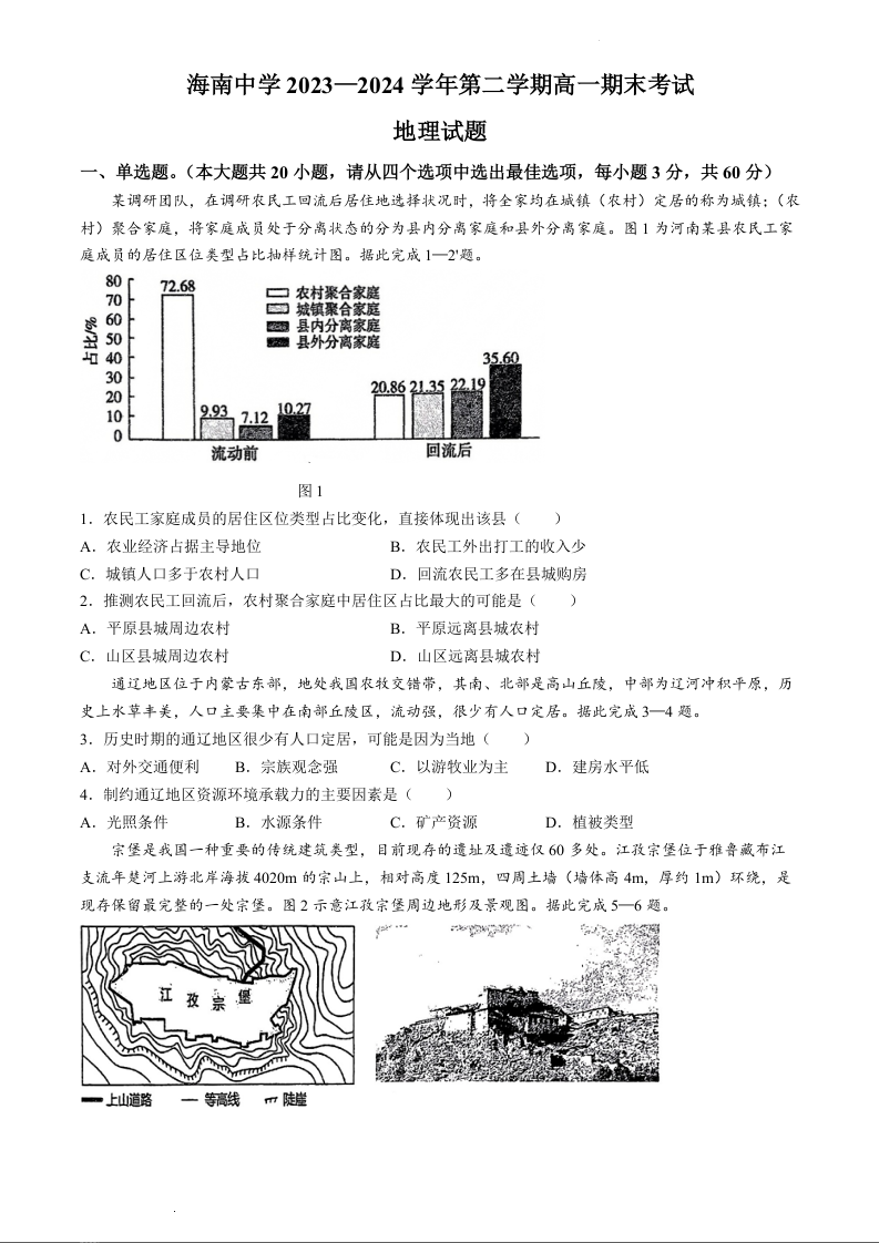海南省海口市海南中学2023-2024学年高一下学期7月期末考试地理