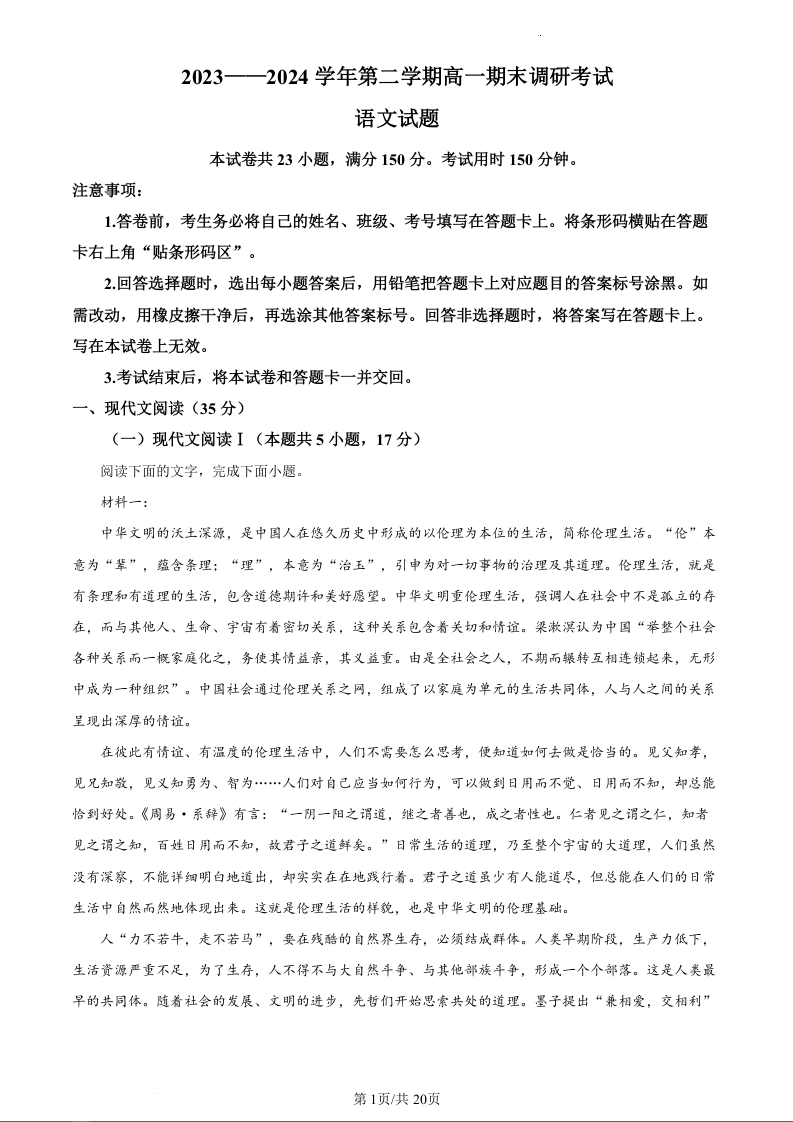 河北省保定市2023-2024学年高一下学期期末调研考试语文(精品解析版)