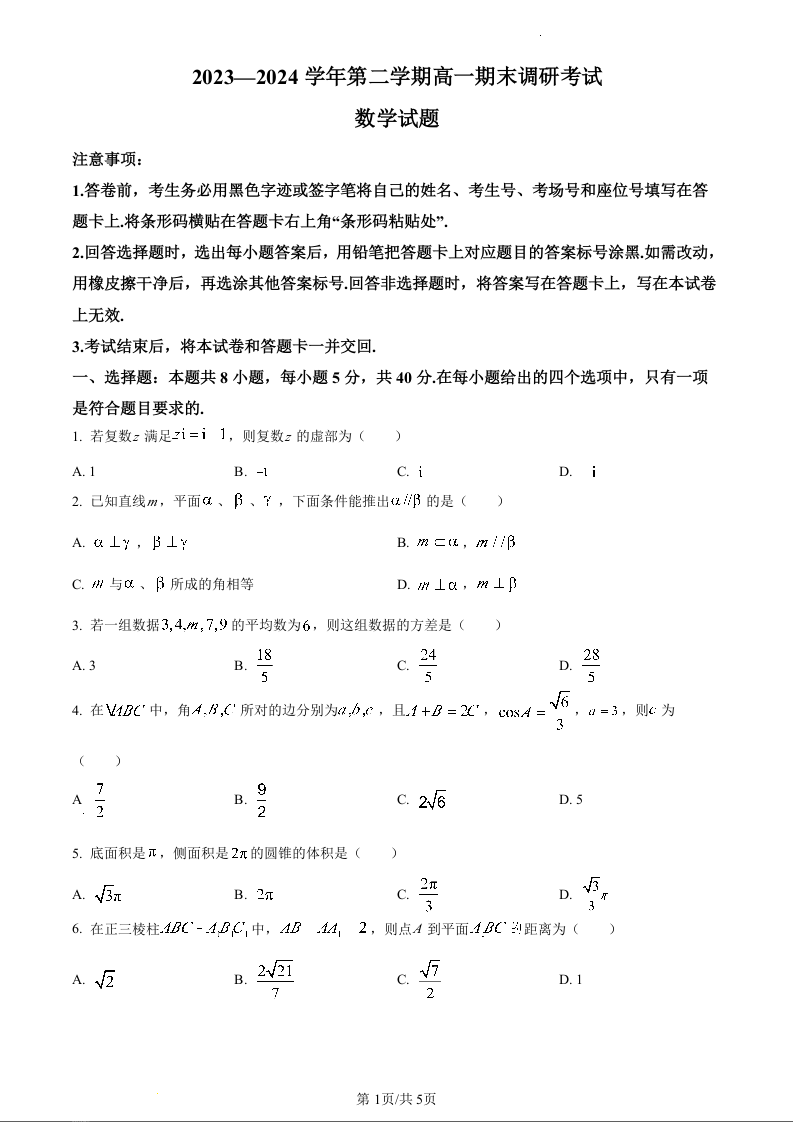 河北省保定市2023-2024学年高一下学期期末调研考试数学(原卷版)